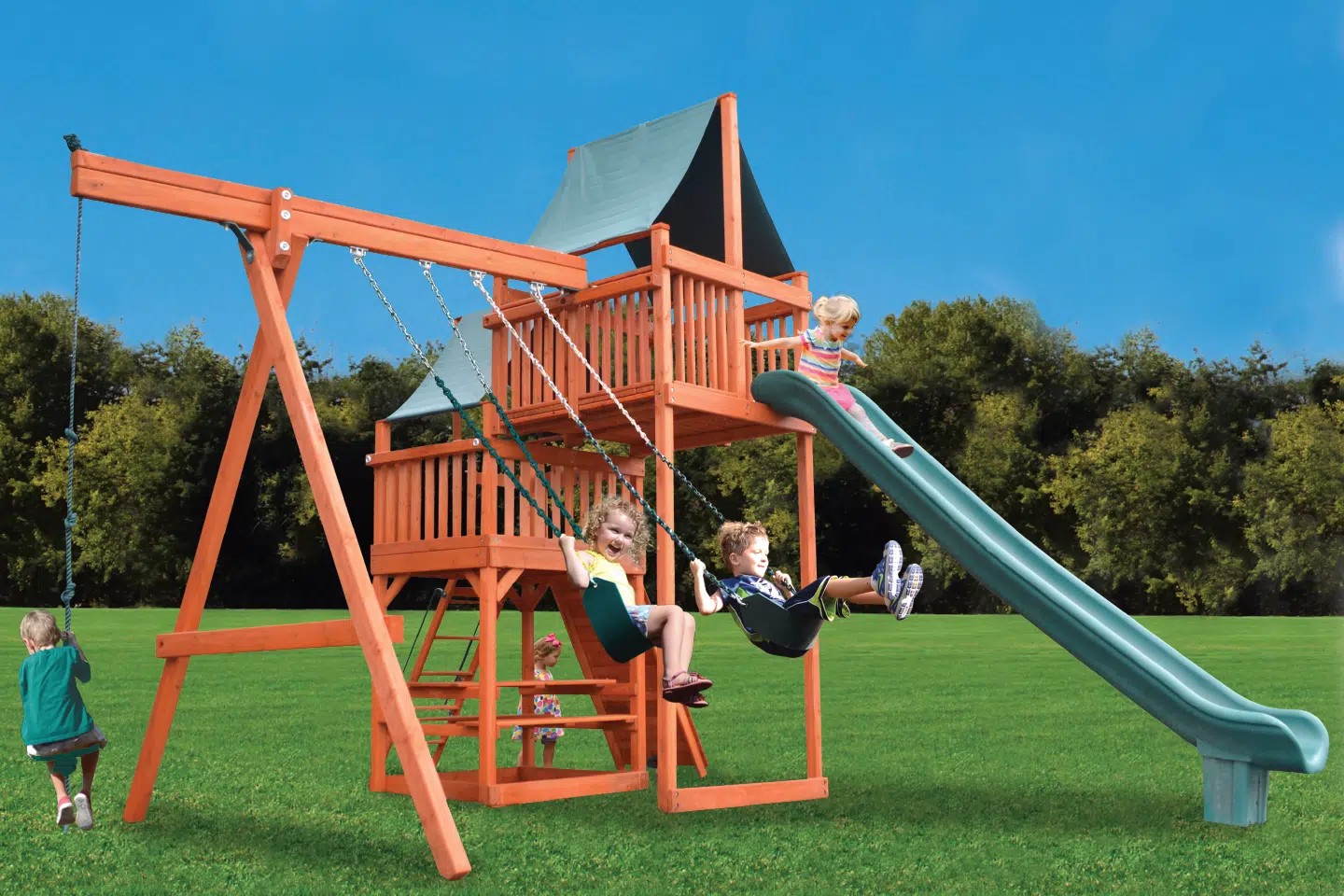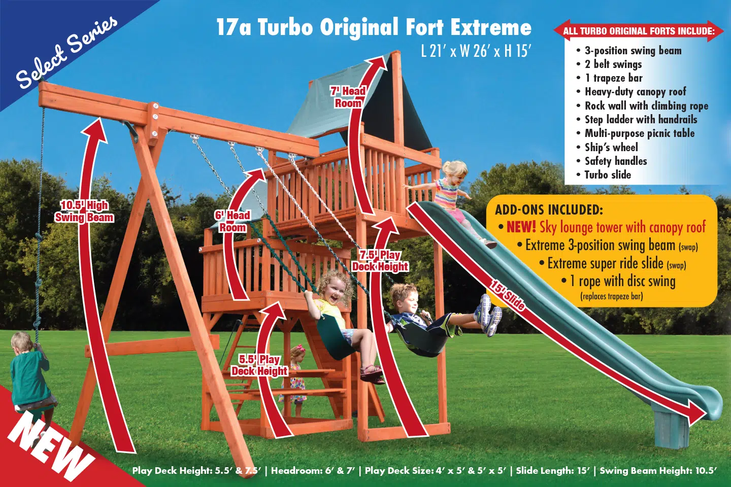 Take it to the Extreme! The all new Turbo Original Fort Extreme has taken our best selling original fort series to new heights. Made to grow into and definitely not out of this fort, it boasts a sky lounge tower at the 7’6″ deck height with an extra high 10’6″ swing beam height. We’ve then paired all that with a super fast 15′ slide. To make this Swingset even more attractive check out the added disc swing! Our promise to you… Nothing compares!